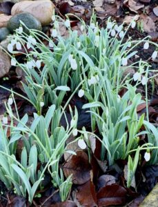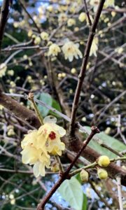 近所の公園には、イギリスの春を告げる野生のスノードロップが既に咲き始めています。雨に濡れた蝋梅の花が冬空にひっそりと薫って